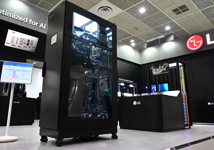 Η παρουσία της LG στο συνέδριο ανέδειξε τις λύσεις ψύξης servers με υγρό, που βασίζονται στην τεχνολογία D2C – μια εντυπωσιακή καινοτομία που εφαρμόζει την ψύξη απευθείας στα chips των servers. Αξιοποιώντας την αντλία inverter υψηλής απόδοσης και τον εναλλάκτη θερμότητας της εταιρείας, η μονάδα διανομής ψυκτικού υγρού (Coolant Distribution Unit – CDU) της LG ρύθμιζε τη θερμοκρασία και τη ροή του ψυκτικού μέσου για τη βελτίωση της ενεργειακής απόδοσης και τη μείωση της κατανάλωσης ηλεκτρικής ενέργειας.
