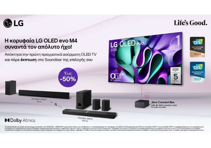 Η LG Electronics (LG) προσφέρει στους καταναλωτές, μέχρι τέλος Φεβρουαρίου και μέχρι εξαντλήσεως των αποθεμάτων, έκπτωση έως και 50% στην αγορά των LG Soundbars SG10 και S95TR, με την αγορά μιας LG OLED EVO AI M4, της πρώτης πραγματικά ασύρματης τηλεόρασης στον κόσμο. Οι καταναλωτές που θα επωφεληθούν της έκπτωσης θα δημιουργήσουν την απόλυτη κινηματογραφική εμπειρία στο σπίτι και θα αναβαθμίσουν την οικιακή ψυχαγωγία τους.